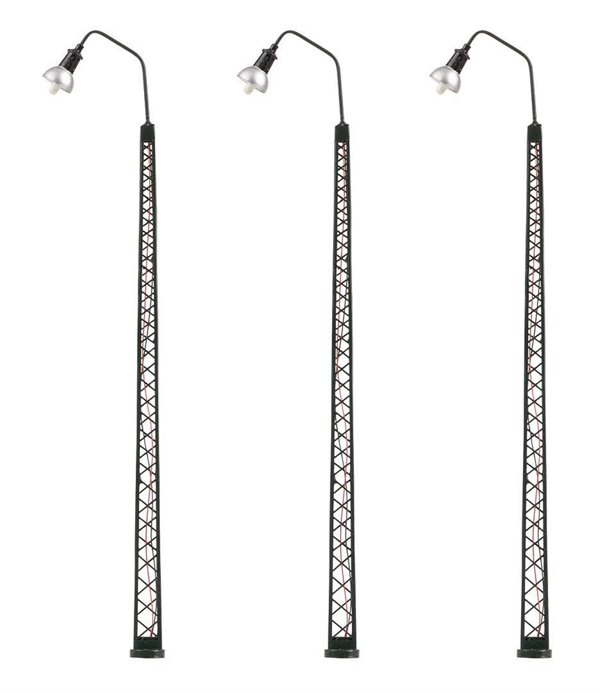 Масштабный набор из 3 решетчатых осветительных мачт 145мм (светодиодных с холодным белым светом) из цветного пластика для самостоятельной сборки. Окраска модели не требуется. Клей в набор не входит. Рекомендуется для диорам в масштабе 1/72, 1/87, 1/100 и железнодорожных макетов типоразмера Н0 (1:87).