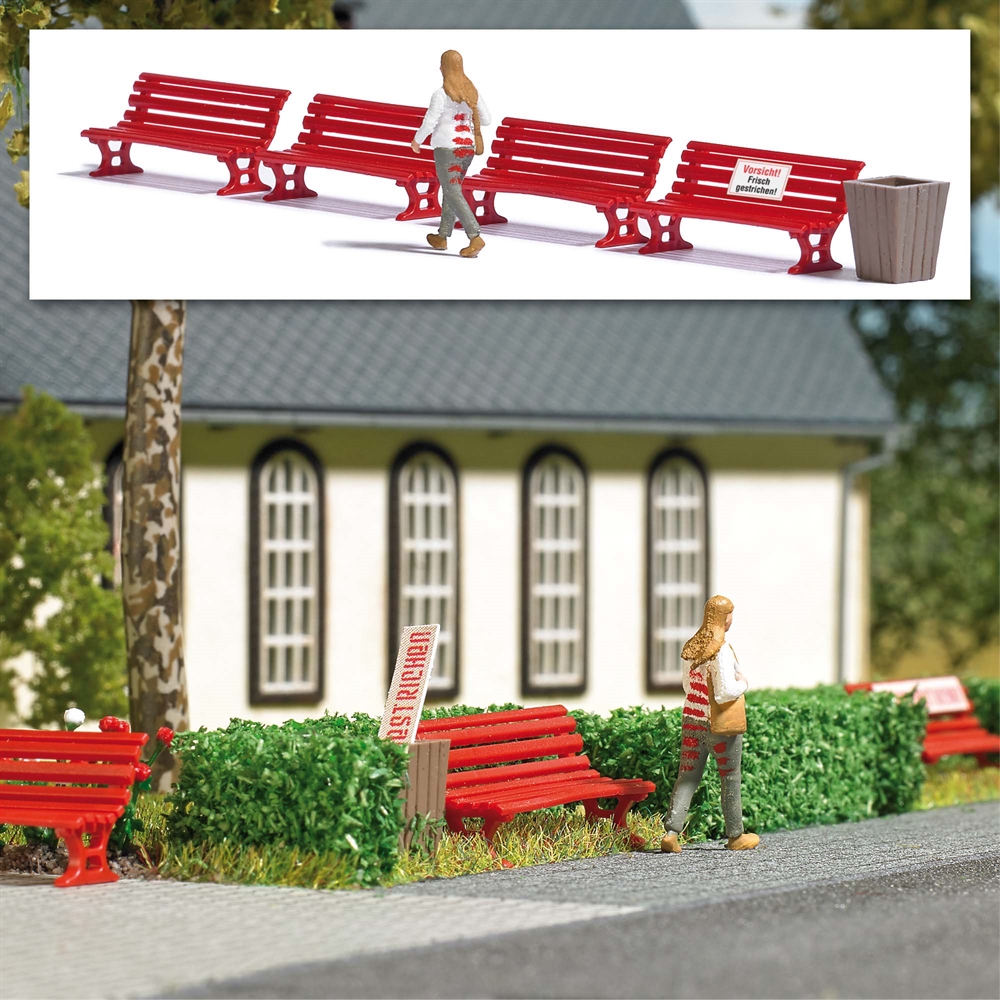 Женщина, случайно сидевшая на свежеокрашенной скамейке в парке. С 2 скамейками и корзиной отходов. Включая таблички «Свежий покрашенный» для вырезания.